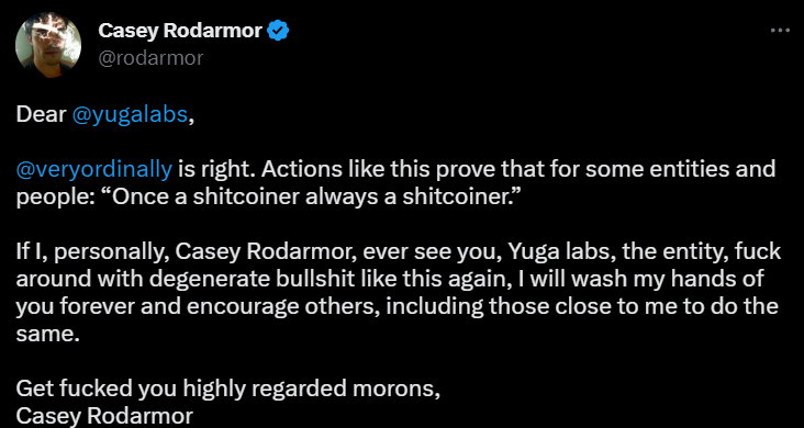 «Если я, Кейси Родардмор, еще раз лично увижу как вы, Yuga labs, еще раз занимаетесь подобным дегенеративным дерьмом, я навсегда разорву с вами связь и буду призывать других делать то же самое», — написал Родардмор.